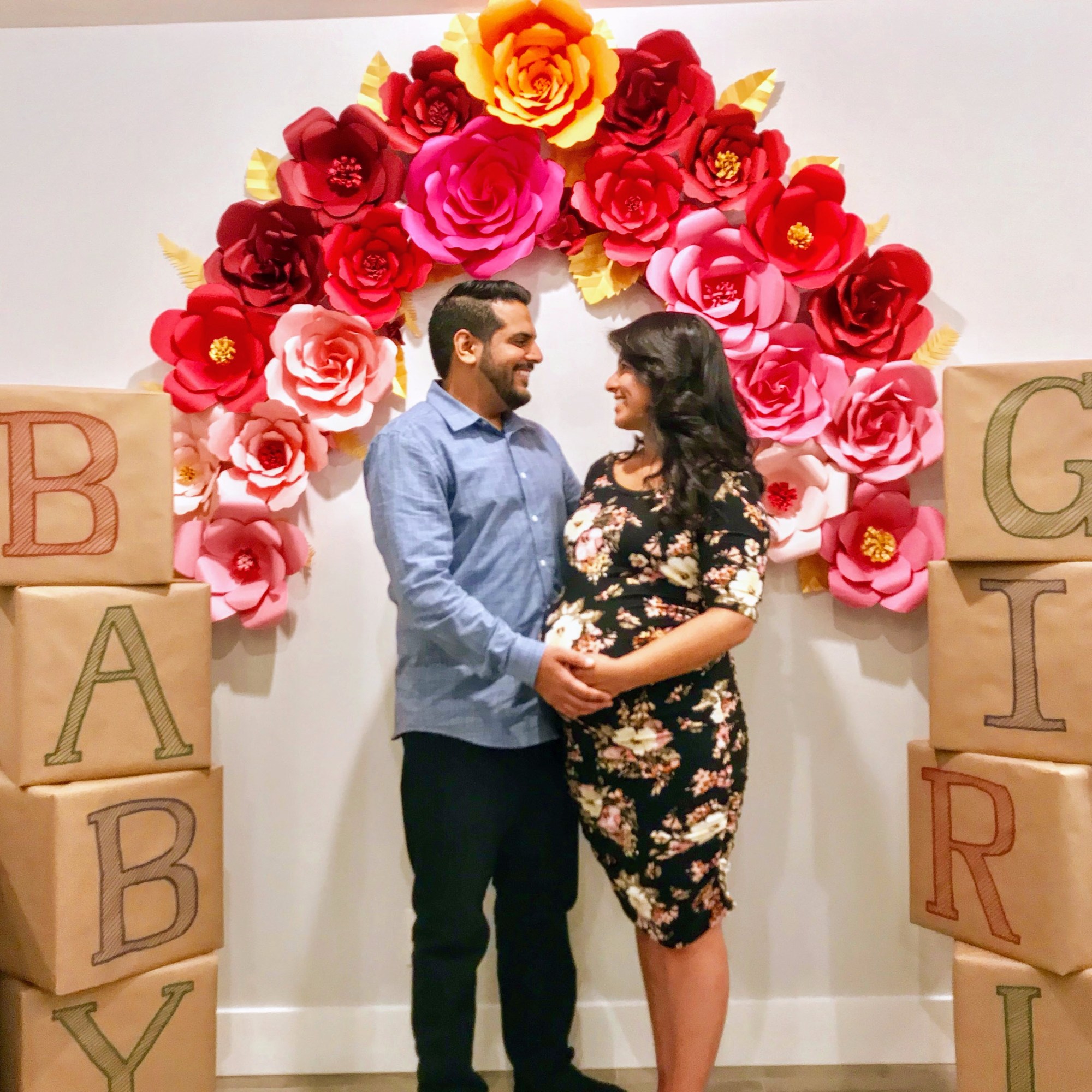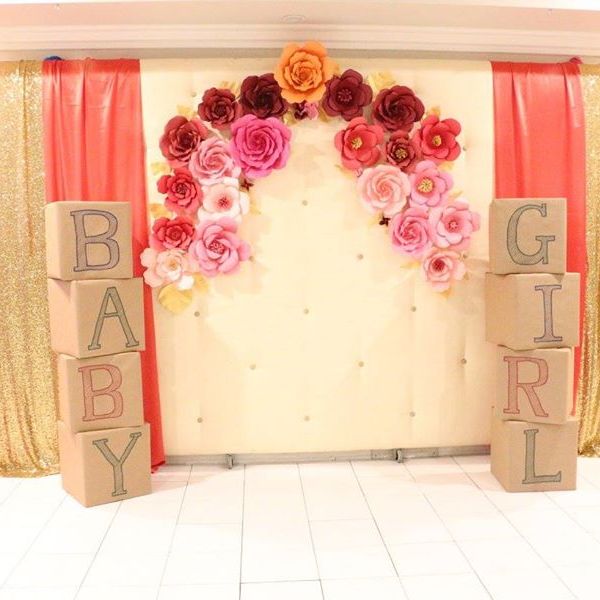 I made a small flower wall for my baby shower this past weekend and wanted to share how I made it. The general concept is pretty easy: