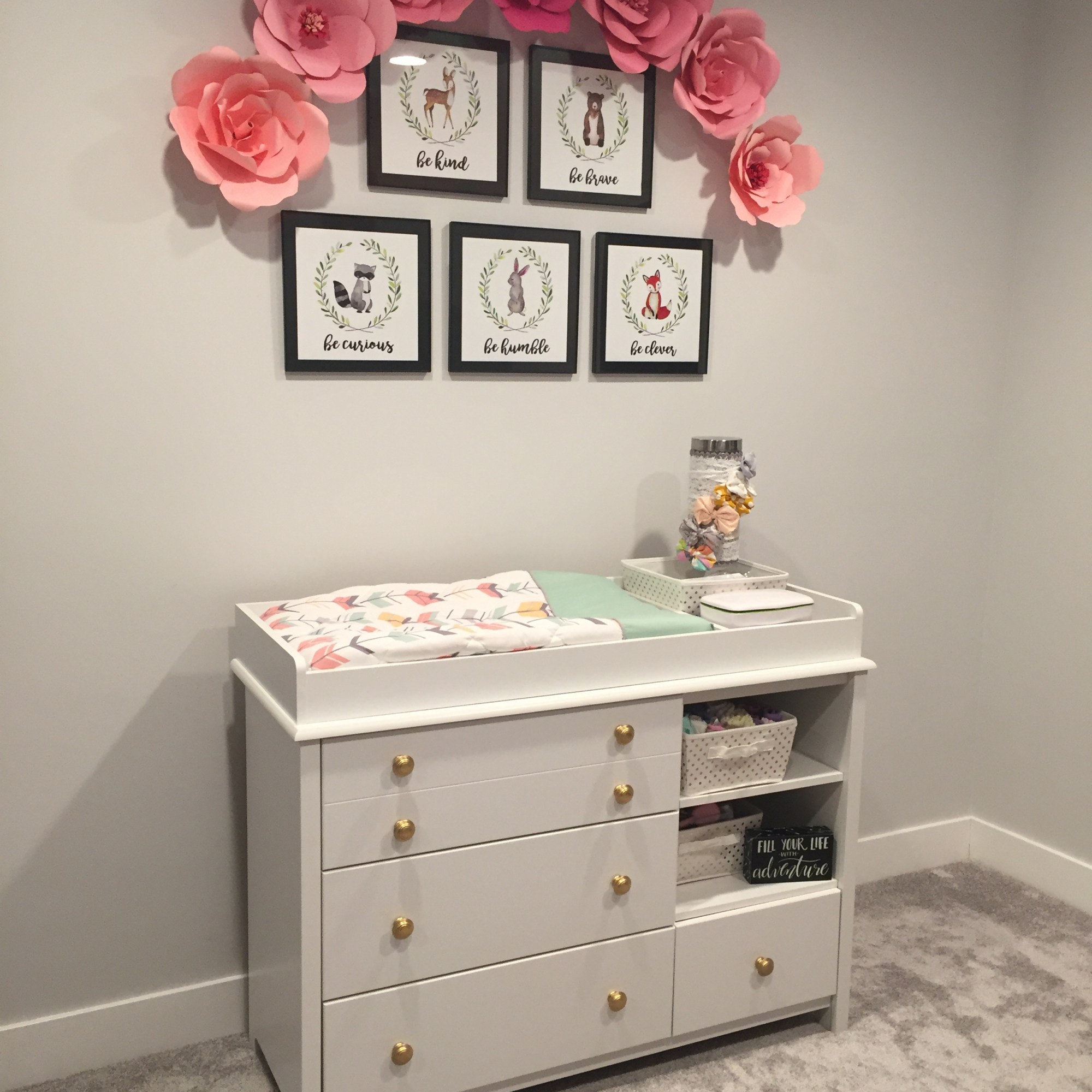 - I’ve also heard of people gluing them on a poster board first and then hanging the poster board up with 3M strips. I wanted to remove them and eventually post them up in her nursery so I wanted to be able to tape and move each flower so the tape/3M strips worked better for me.